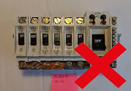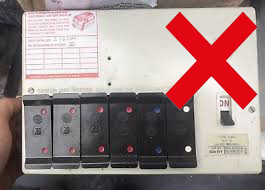 - There are blanking plates or fuse holders missing, leaving live parts exposed.